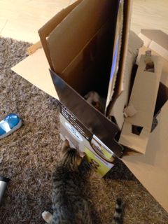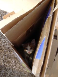 捨てるダンボールをまとめておいたら、隙間にメルが入っていました。出れないみたい…。ミャアミャア鳴いて出たがるくせに、出してあげようとするとイヤがるので、しばらく放置(笑)