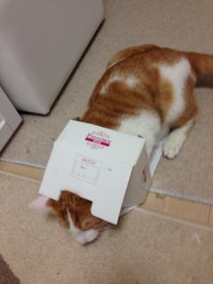 紙袋や箱には入らないと気が済まないメルは、ママが潰した花材の空き箱ですら入ろうとします。明らかに納まりきらないのに、なんでそんなに入りたがるんだろ?!(笑)