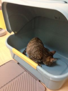 次はソナが調査。ソナはまだ小さいから、向きについては仕方ないかもしれません。それに、もともと砂掛けはあまりしないので、ニオイについても改善は望めないかも(苦笑)今回のトイレはメルをターゲットにした対策ですな、うん。