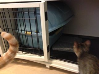 ニャンコケージに設置。縦がめいっぱいなので、週末のオール洗い&天日干しの時には、ケージの中板を外して出し入れが必要。前のはシンプルな箱形で高さもそれほどなかったので、扉口から出し入れが簡単に出来たんですけどね。ま、しょうがないか。