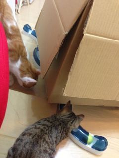 荷物を開封した時に、箱がプレイサーキットにかぶってしまい、サーキットの1部が隠れてしまいました。それが面白かったようで、ニャンズが夢中になって遊び始めました。