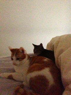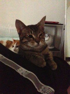 ソナはメルが大好き。いつもメルの背中を追っています。メルはメルで、そんなソナを優しく見守っています。時々ケンカ?と思える激しい戯れ合いをすることもあるけれど、仲良しのニャンズです。