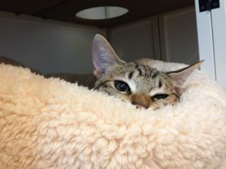 母猫とはぐれたらしく、鎌倉のお稲荷さんの橋の下でうずくまっているところを保護されました。保護主さん宅では家の事情で引き取ることが出来ず、病院に預けられること3週間。優しい先生と看護師さんに大事にケアされて、そして毎日保護主ママさんが様子を見に通って下さったこともあり、風邪も治って毛並みもツヤツヤ、元気な美人さんになりました♪