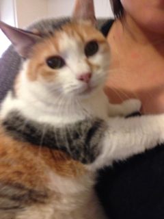 こちらはルーちゃん、年齢不詳。オフィスの前でヨレヨレになっていたところをカオリさんにレスキューされました。当初はガリガリのケバケバだったそうだけれど、毛並みもツヤツヤ、とっても美人さんです。三毛猫なのだけれど、黒い部分がトラ柄なのが可愛い♪ とてもおとなしくて、でもカオリさんが席を立った隙に椅子に座ってしまいました(笑)その後はずーっとカオリさんとマリコさんとのおしゃべりに静かに耳を傾けていたよ。