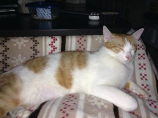 コタツで横になっていたら、メルがお腹に乗ってきました。幸せ〜♪ でも背中痛い…。はてさてどうしたものか…と悩んだ結果、シングルの掛け布団で寝ることにしました。