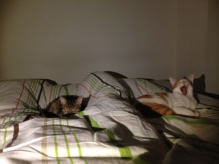 まさかねぇ、でもねぇ、が頭の中をグルグル。ショックもあったし。ぼんやりベッドで横になっていたら、突然メルが掛け布団をカキカキ。何かと思ったらソナタがおしっこしちゃったのをメルが必死に隠そうとしていました…。え、なんでこんなところで?今までしたことなかったのに?!深夜だというのに掛け布団を片付けて、とりあえずパパとリビングで寝ることに。