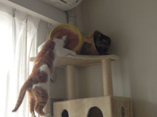 フリースタイプのチューブをキャットタワーのてっぺんに置いたところ、ニャンズが交替交替で入っています。たまたま掃除機をかけるのにぽいっとそこに置いたのが良かったみたい。ここだけは仲良く譲り合っています♪