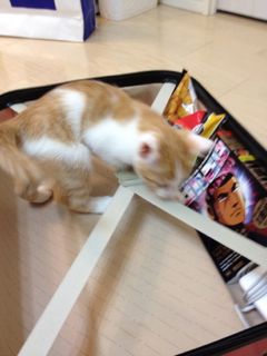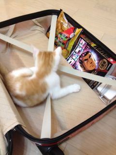 出張から帰って来たパパ。スーツケースを開けるなり、メルが飛び込んでチェック。あっちをクンクン、こっちをクンクン。