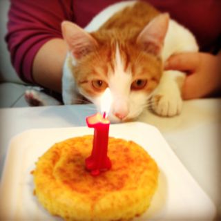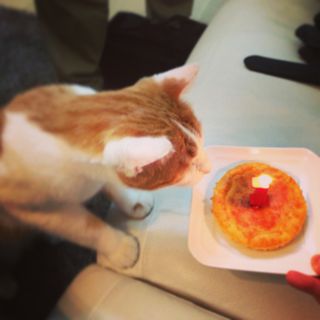 ニャンコ用レシピでケーキを焼きました。どんな願い事をしたのかな。メルもソナタも喜んで、あっという間に食べてしまいました。もちろん、ホールは多すぎなので一口分だけ。今日から数日に分けて、美味しいおやつだね☆