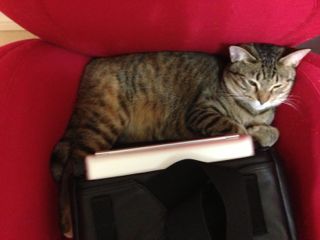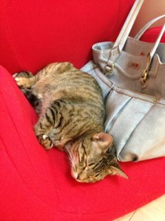 やっと場所が空いたと思ったら、今度はパパがバッグを置いてしまいました。そんな無理して隙間で寝ることないのに、やっぱり自分の場所だから頑張ってしまうソナタです。