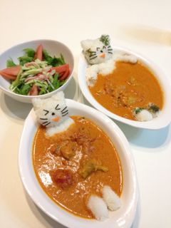 以前、これの人型アレンジを見て「絶対ネコで作ってやる〜」と誓っていた割には、うっかりすっかり忘却の彼方…だったのですが、友人のキャラ弁を見てはっと思い出しまして(笑)ちょうどバターチキンカレーを作ったので、ここぞとばかりに昨夜トライしてみました〜。奥のニャンコはパセリ、青のり、胡麻の三毛猫のつもり。 パパは「どこから食べていいのか…」と困った様子(笑)友人には「あはは、浸かってる〜」と受けてました♪