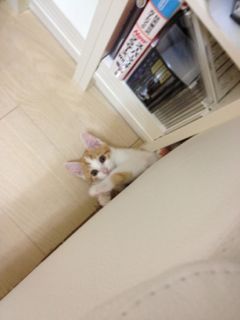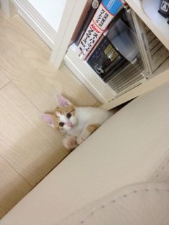 パパが「そーっと覗いてごらん」というので見てみたら、ソファの下に潜っていたメルが顔を出していました。