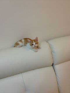とりあえず。パパがワックスを塗っている間、メルにはケージに入ってもらいました。1度塗りが乾いたところで、一旦ケージから出したら、床で遊んでいたんですけどね…パパが「さて、2度塗りするかなー」とふと見たら、なんとソファにメルが…!私たちも座ってないのにー(苦笑)