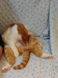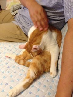 ソファにいる時はパパ、ベッドにいる時はママに寄りかかって、のどをグルグル鳴らしながら足の付け根をペロペロするのがクセです。よく分からないけれど、落ち着くんだろうなぁ。