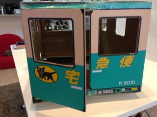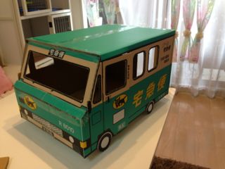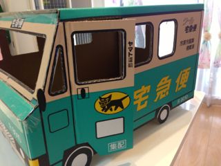 猫飼いの間で静かなブーム、「クロネコヤ○ト」のクール便。某営業所の近くまで来たついでにお買い上げ。クール便のイラスト(?)の入ったダンボールなのですが、これを車の形に仕上げるのがポイントです。壊れないように透明テープでしっかり貼ったので、ところどころテカっていますが、