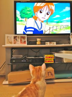 おとなしくしているなーと見たら、なんとテレビでやっていたONE PIECEをじーっと観ておりました。友人いわく「ニャンコもナミちゃんの魅力にやられたのでは?(笑)とのこと。老若男女を問わず大人気のONE PIECE、猫にとっても面白いんですね☆