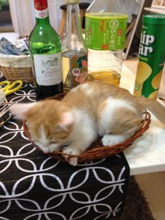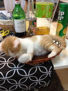 ホームパーティーの片付けをしようとしたら、メルがバスケットに入っておりました。