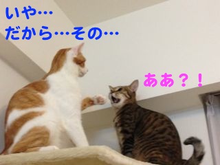 実はニャンズ、圧倒的にソナタが優勢な状態でにらみ合いの真っ最中。1枚目の写真を見るとソナタのイライラがしっぽに表れているのが分かるでしょ?(笑)