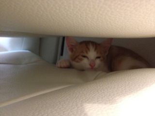 ソファの下だけではなく、真ん中の椅子を倒してテーブルにしたその隙間にも入り込んでいます。ここは結構気に入っている様子。