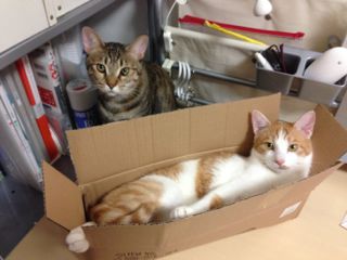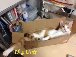 帰宅してわーっとはしゃいで落ち着いたところで、早速箱を発見→IN。大きさとしてはジャストフィットか?と思ったけれど、横になるとちょっとキツいみたい。