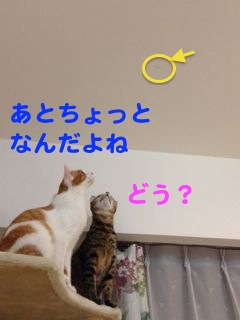 こんな季節でも飛んでいる蚊…。そのほわほわ〜〜と飛ぶ様が気になってしまうニャンズ、天井に止まった蚊を取ろうと必死です。