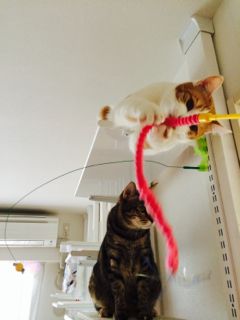 キャットウォークの最上段から手を伸ばして、猫じゃらしを両手でキャッチ!すごい器用だけれど、お願いだから落ちないでよ〜〜!!