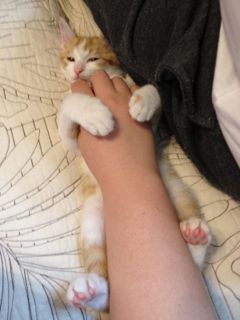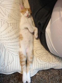 腕を抜いたら、今日はぴよーっと足を伸ばして、こんな格好で寝ていました。伸び切っちゃってるよ、メル(笑)