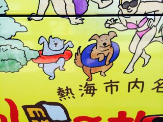 熱海の観光地を周遊するバスのイラスト。このニャンコのポーズって、映画「MATRIX」で流行ったよね?(笑)ワンコのポーズも面白いけど。