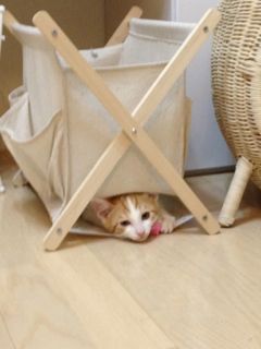 隙間を見つけては片っ端から潜り込んで調査しています。新しく見つけた場所は、新聞紙を入れているラックの底布。大好きなキラキラボールを持ち込んでいました。ほんと、よくそんなところを見つけるなぁ。
