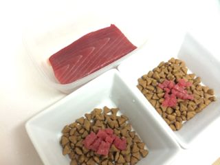 結局、ウェットフードを少しまぜてやっと食べました。