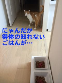 ママの期待をよそに、ごはん台に近づこうともしないニャンズ…。