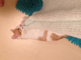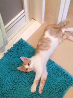 髪の毛を拭いている間は足下にいるメルにタオルが届かないので、バスマットの上でごろんと休憩タイム。実はこういうのがもう2週間以上も毎日毎回続いていて、パパにもママにも同じことをします。きっとメルなりに何か面白いんでしょうねぇ。