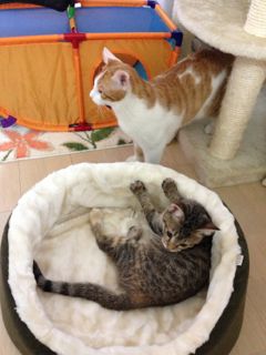でも一番のお気に入りは大人ベッド。パパと二人でベッドメイキングをしていたら、ニャンズもやってきて大騒ぎ。メルはシーツに潜って出て来ないし、ソナはサイドボードからダイビングしてくるし、二人でぴょんぴょんうさぎのように飛び跳ね回って、なかなか作業を進ませてくれません。お取り寄せで2週間待ちだった新しいシーツセット、やっぱり一番乗りはニャンズなのね…。