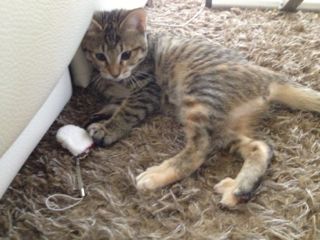 母猫とはぐれたらしく、鎌倉のお稲荷さんの橋の下でうずくまっているところを保護されました。保護主さん宅では家の事情で引き取ることが出来ず、病院に預けられること3週間。優しい先生と看護師さんに大事にケアされて、そして毎日保護主ママさんが様子を見に通って下さったこともあり、風邪も治って毛並みもツヤツヤ、元気な美人さんになりました♪