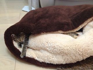 メルとソナがお団子になって寝るのが見たい!というママの願望を叶えるべく、また来る寒い季節に備えて、モフモフベッドを買いました♪ 外側にめくればベッドになるし、そのままダランとすれば袋になるので隙間好きにはたまらない、というこの一品(笑)